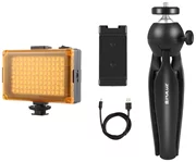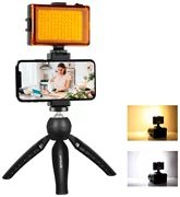 Триножникът се предлага с LED лампа, двоен стъпало за вход на телефона, стойка за бюро и чанта за съхранение, които, когато се комбинират с вашия телефон или камера, създава готов за употреба комплект.