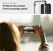 Закалено стъкло от серията „AlignMaster"от Spigen беше закрепено с перфектно нарязан на предната част на телефона с монтажна рамка, благодарение на която перфектно го позиционирате на екрана. Производителят опрости метода на сглобяване до такава степен, че е напълно интуитивен за всеки потребител.