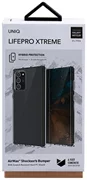Хибридната кутия UNIQ LifePro Extreme, проектирана на базата на технологията AirMax™ 360°, прави Samsung ефективно защитен от въздействието на различни ежедневни събития, докато дизайнът на Slim & Clear подчертава естествената красота на телефона. Благодарение на използвания материал TPU - гъвкава и в същото време силна рамка сигурно завижда на устройството, осигурявайки защита и тънък, минималистичен външен вид. Калъфът е обогатен с технология въздушна възглавница в ъглите за още по-добра защита при евентуално падане. Осигурява трайност по време на удара, потвърдена от 6 фута Бетон сертификат. Калъфът е покрит с антистатичен слой, който предотвратява събирането на прах и свежда до минимум количеството драскотини. Той има интегрирани капаци на бутони и изрези за портове. Повдигнатите ръбове предпазват екрана и камерата от надраскване при контакт с равна повърхност.
