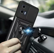 Оборудван е с лесен и удобен за използване плъзгач, който може да се прибира по всяко време. Практичен капак ще предпази обектива от неочаквани повреди.Въртящият се на 360 градуса пръстен може да се използва чудесно като стойка за гледане на видеоклипове, като дръжка за пръстите, за да държите телефона сигурно в ръката си, или дори като стойка за магнитна стойка за кола.
