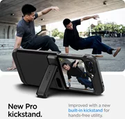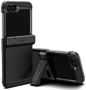 Калъф SpigenТвърда броня Proе перфектната защита за вашето устройство. Конструкцията му е изработена от устойчива на износване термопластмаса и подсилваща поликарбонатна рамка. Леко повдигнатата форма на калъфа около камерата и екрана го предпазва от надраскване, като повдига телефона точно над плоската повърхност. Разполага с капаци за бутони и изрези за портове.