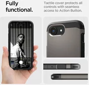 Калъфът пасва идеално и не ограничава безжичното зареждане.Леко повдигнатата форма на калъфа около камерата и екрана го предпазва от надраскване, като повдига телефона точно над плоската повърхност. Разполага с капаци за бутони и изрези за портове.
