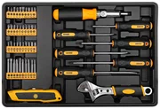 В комплекта ще получите до 30 бита от тип 25L и 10 от тип 50L. Има и отвертки, гаечни ключове за различни приложения, 4 вида клещи, ниво или чук за нокти. Комплектът DKMT95 включва също 1/4 „и 3/8" гнезда. Пълното съдържание на комплекта, включително размерите, можете да намерите в секцията по-долу.